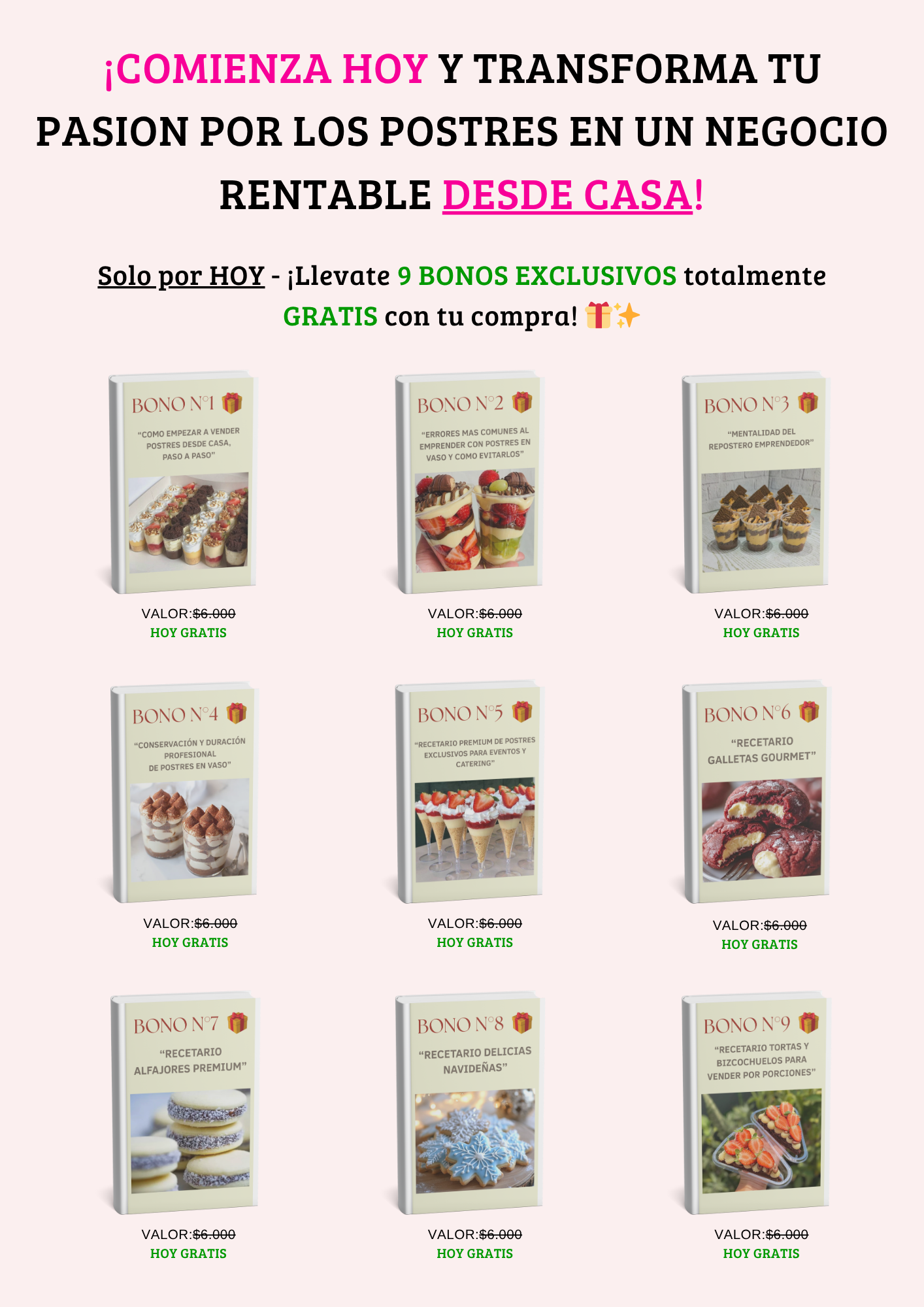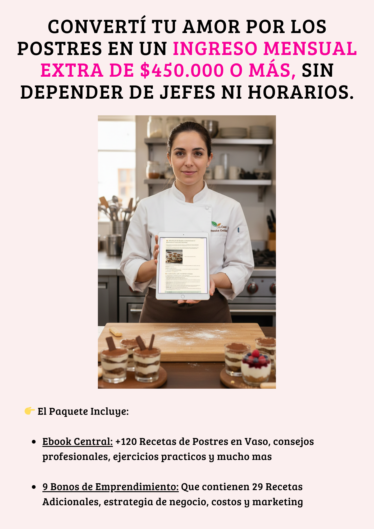 Buenos Aires, Argentina“Gracias a este ebook aprendí a hacer postres profesionales desde casa. Mis primeros vasos los vendí en una feria local y se agotaron.”